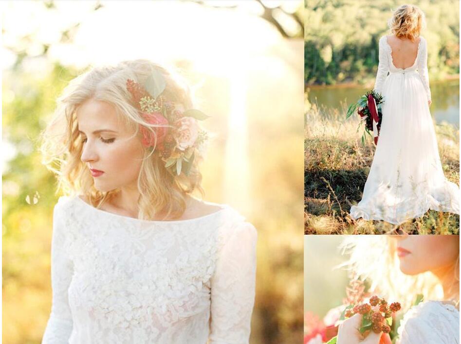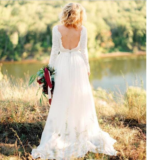 Country Boho Wedding Dresses Backless Scoop Neck Long Sleeves Lace Chiffon Beach Wedding Dress Cheap Bridal Gowns