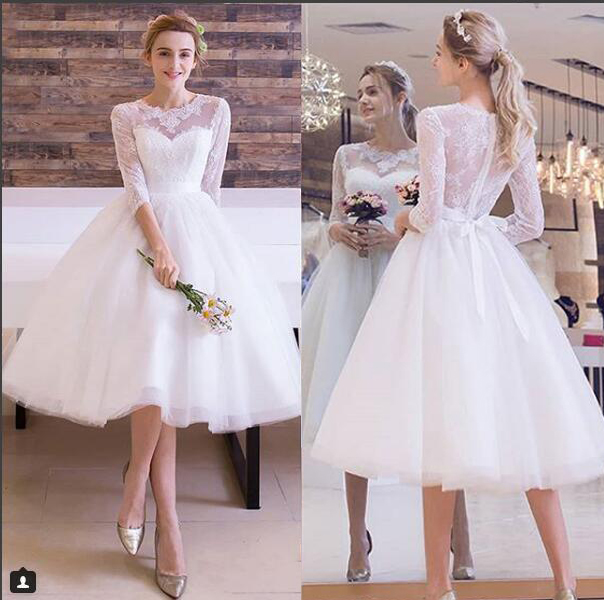 2023 Elegant White Vintage Dresses Lace GownTulle Shorts Wedding Dress 3/4 Long Sleeves Beach bridal gowns
