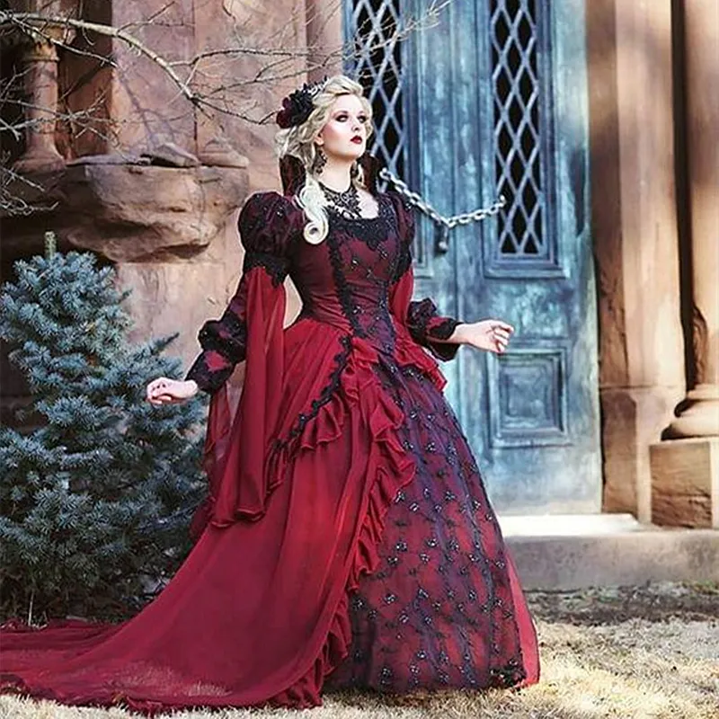Vintage Gothic Victorian Wedding Dresses Long Sleeve Medieval Steampunk Burgundy And Black Bridal Gowns Lace Appliques