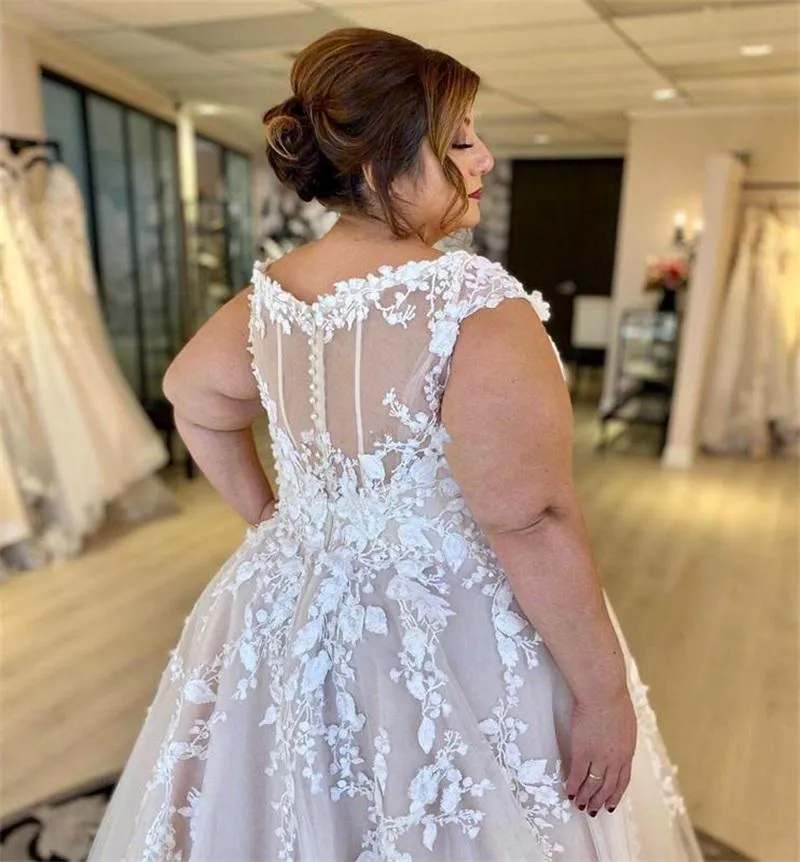 Plus Size Wedding Dresses Bridal Gown with 3D Floral Lace Applique V Neck Sweep Train Tulle Custom Made Covered Buttons Back vestido de novia
