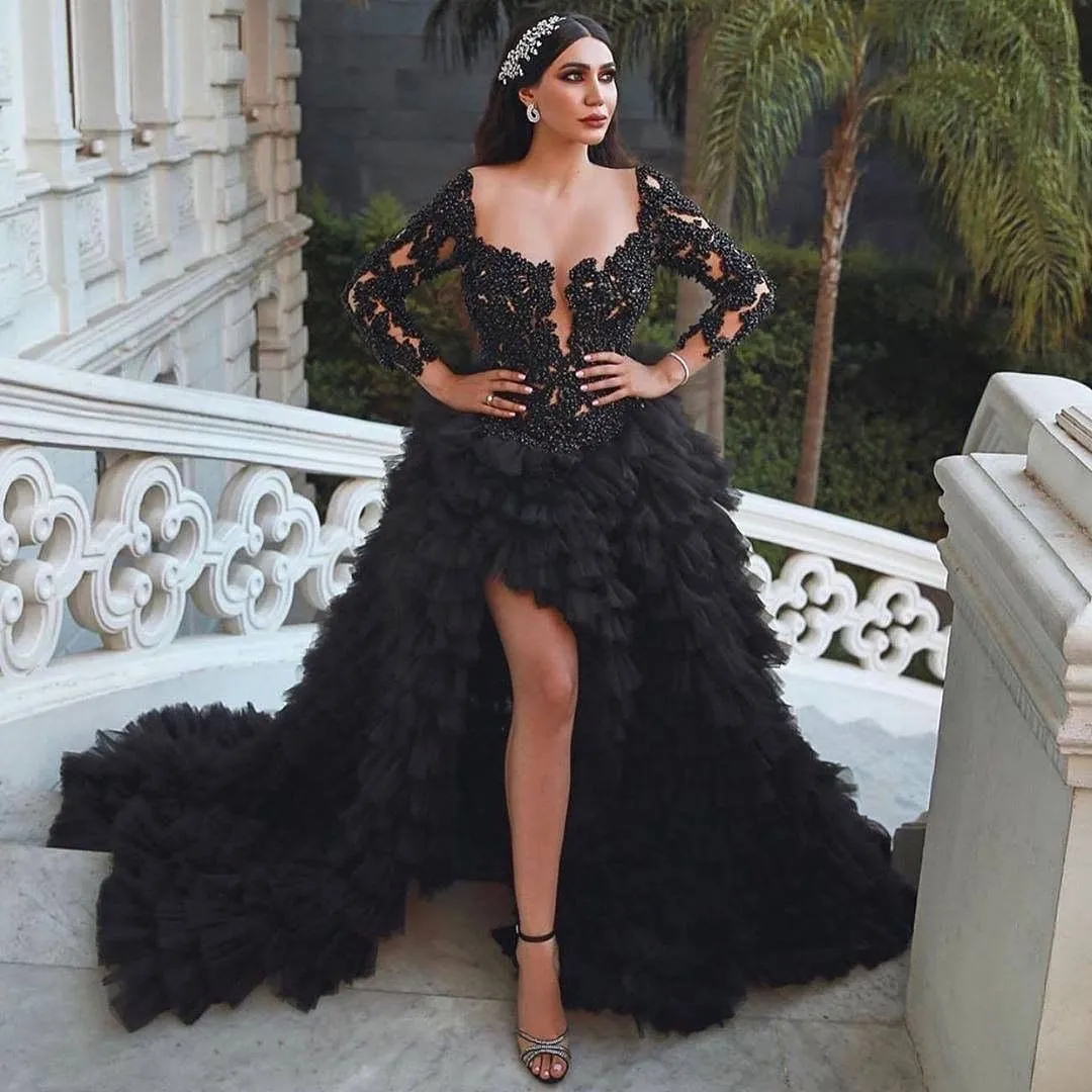 Black Beaded Lace Wedding Dresses Square Neck A Line Long Sleeves Backless Bridal Gowns Side Split Tiered Chapel Train robe de mariée