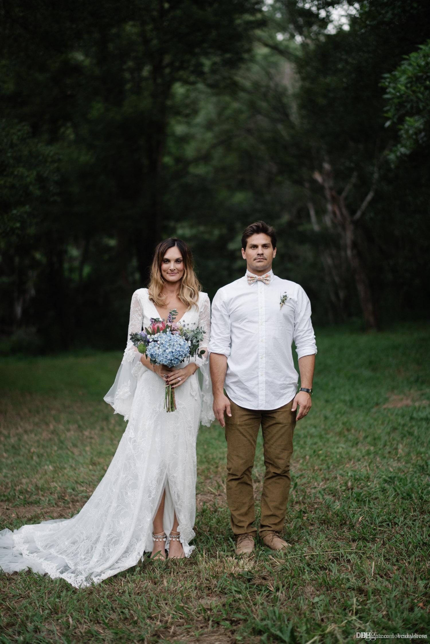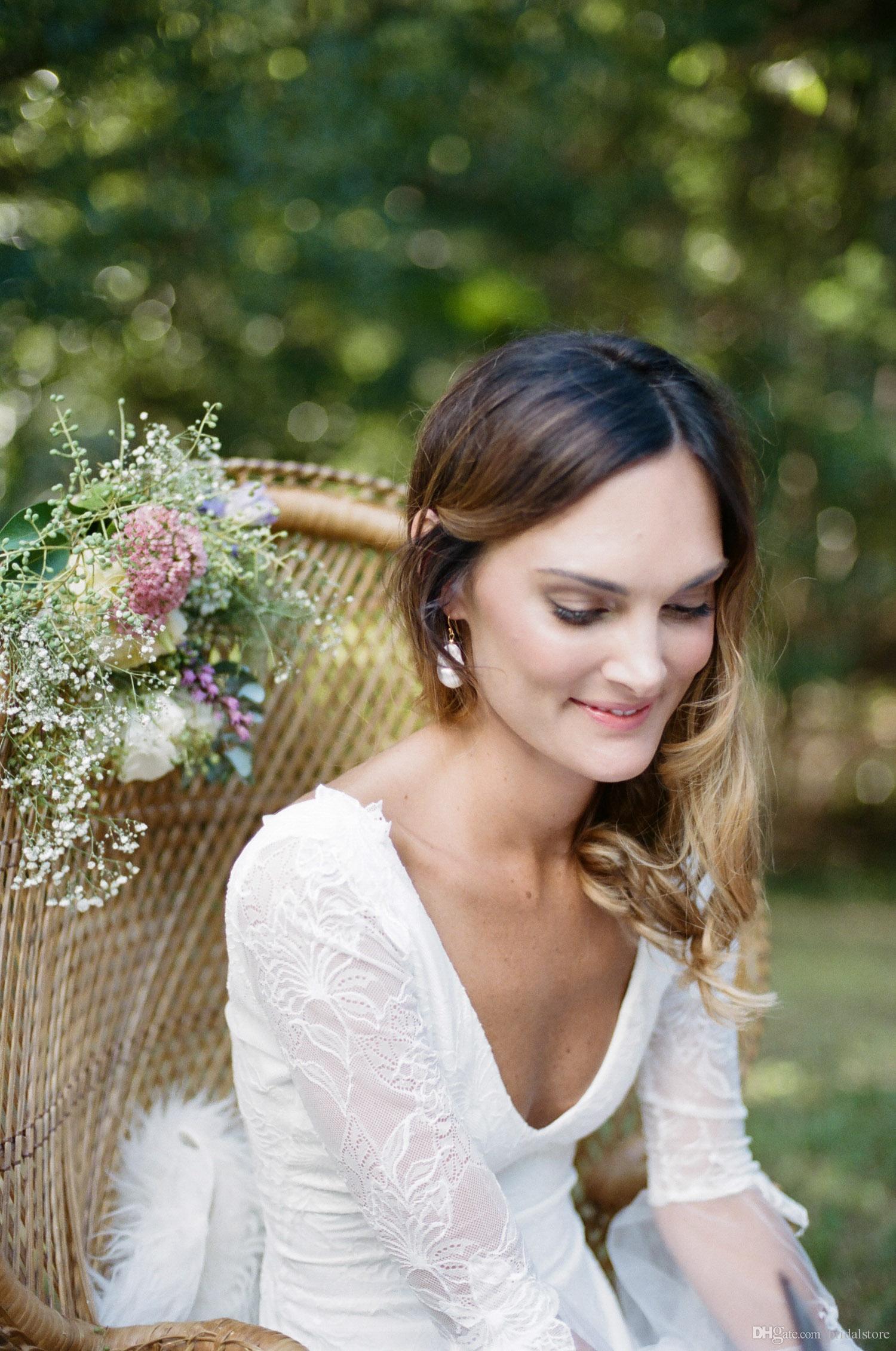 Country Bohemian Wedding Dresses V Neck Sexy Backless Sweep Train Simple Lace Wedding Dress Boho Custom Made