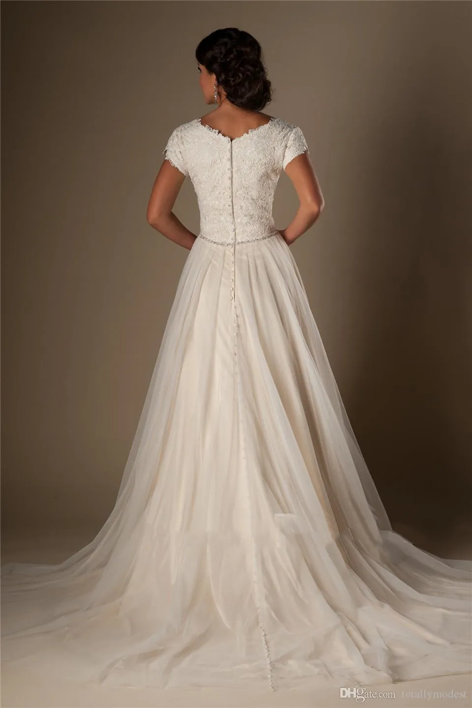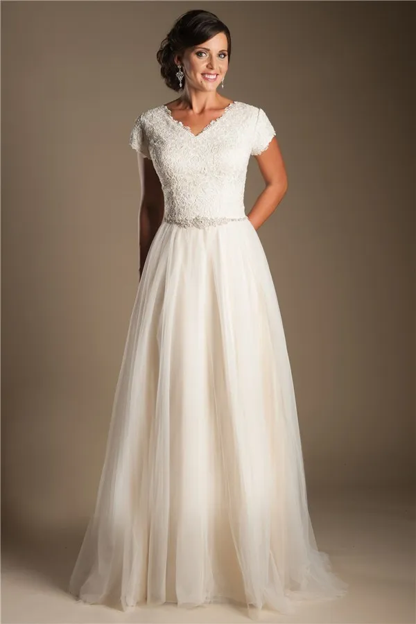 Short Sleeves Modest Wedding Dresses Cap Sleeves V Neck Buttons Lace Tulle Bridal Gowns A-line Inexpensive Wedding Gowns