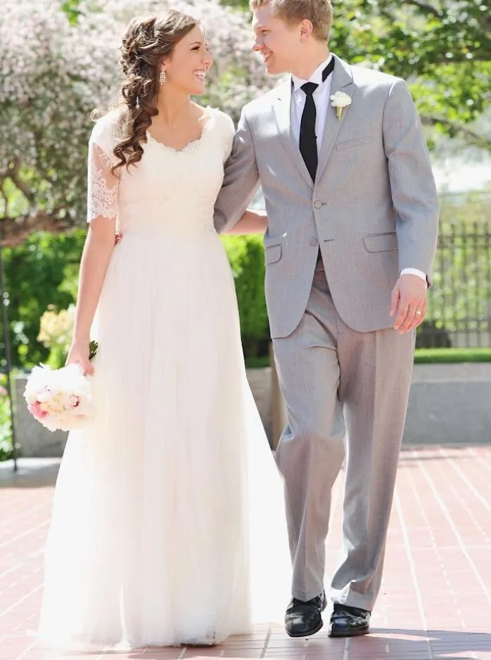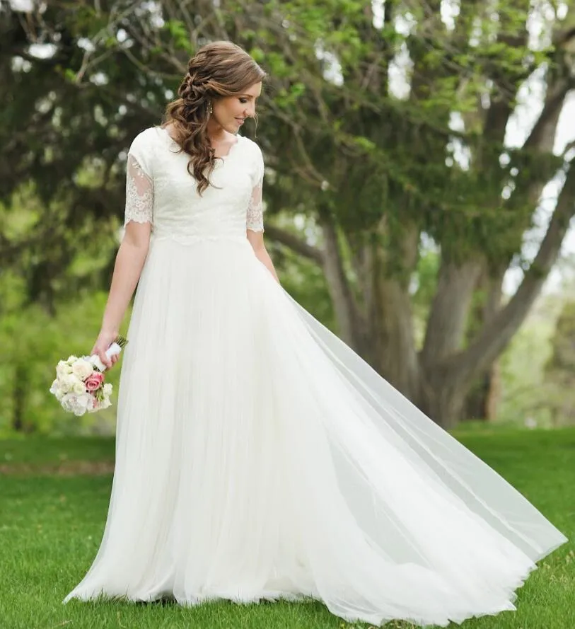 A-Line Lace Tulle Beach Modest Wedding Dresses Short Sleeves Cheap Simple Summer Garden Informal Reception Bridal Gowns Mature Bride