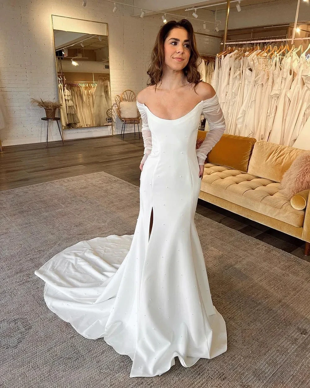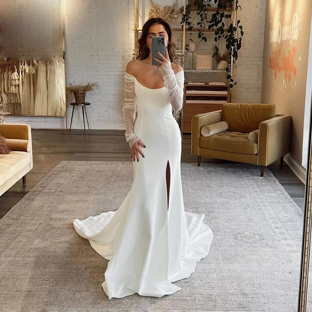 Beautiful Fascinating Wedding Dresses A Line Gorgeous Satin Simple Off Shoulder Long Sleeved High Slit Mopping Bridal Gowns