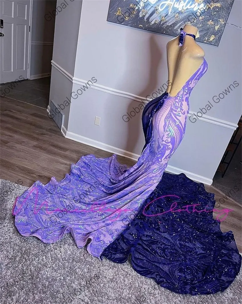 Sparkly Sequined Mermaid Long Prom Dresses Black Girls Halter Sleeveless Evening Dress Party Gowns Robes Vestidos Noche