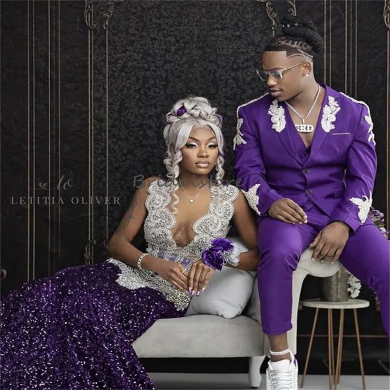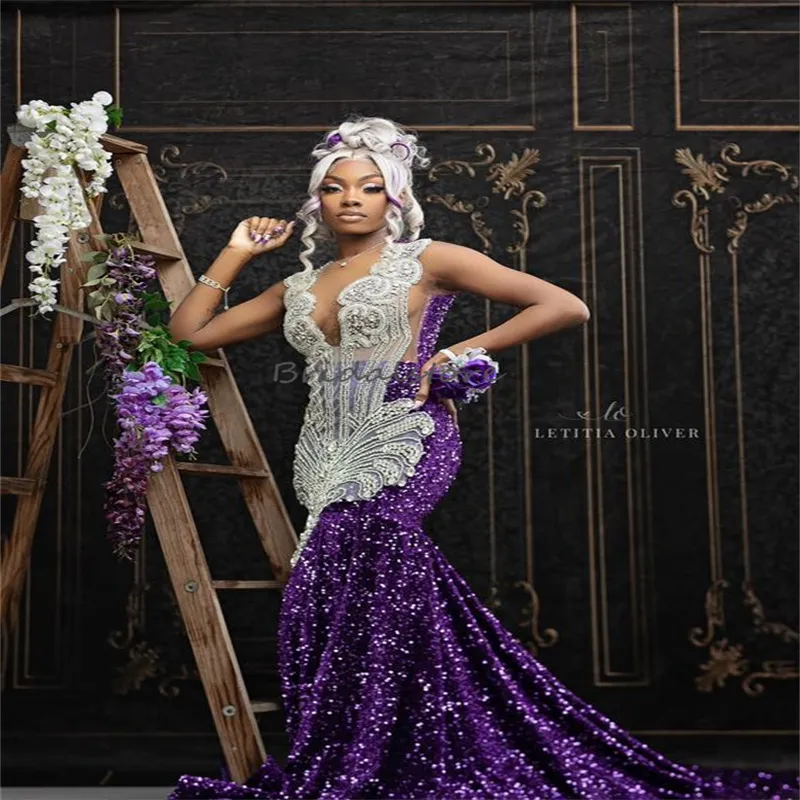 Black Girls Purple Prom Dress Rhinestone Crsytal Mermaid Evening Gowns Luxury Beaded Birthday Occasion Party Gowns