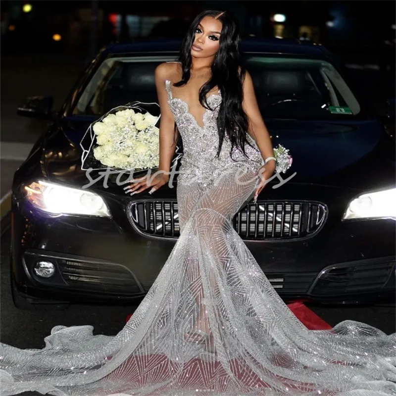 Sparkly Silver Sequin Prom Dress See Through Plus Size Diamond Crystal Evening Gowns Black Women Formal Birthday Promdress