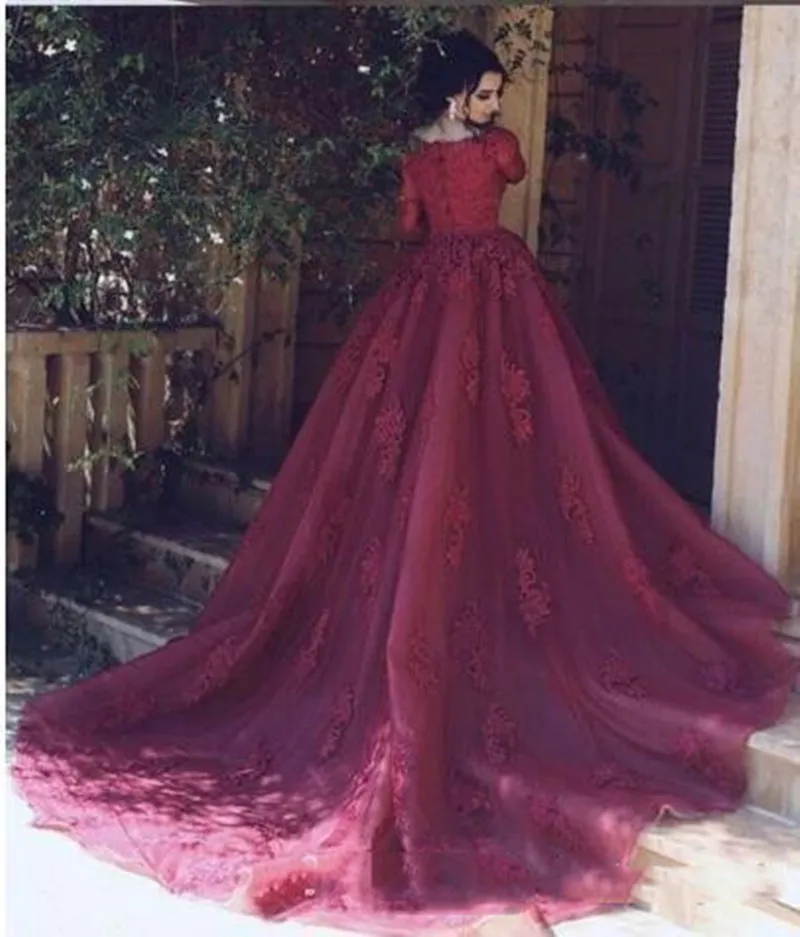 A Line Burgundy Bridal Gowns Lace Gothic Muslim Wedding Dresses Short Sleeves With Wrap Tiered Skirts