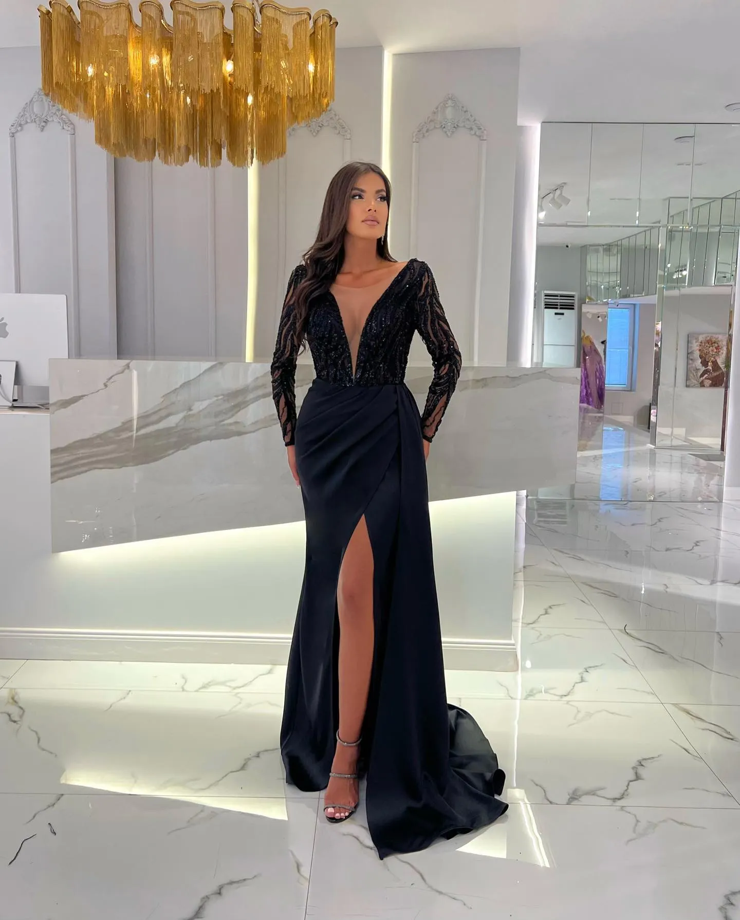 Elegant Sheath Black Evening Dresses Illusion V Neck Long Sleeves Beading Party Prom Dress Split Long Dress for special occasion